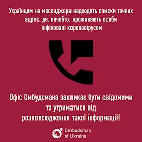 До Уповноваженого Верховної Ради України з прав людини надійшла інформація про те, що деякими особами з використанням месенджерів (Telegram, Viber, WhatsApp тощо) поширюються списки точних адрес (із зазначенням номерів квартир) де, начебто, проживають особи інфіковані коронавірусом.