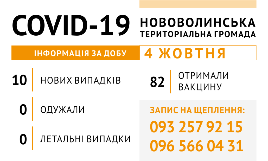 Станом на 4 жовтня у Нововолинську загалом вакциновано 15595 осіб, за останню добу – 82 жителі громади.