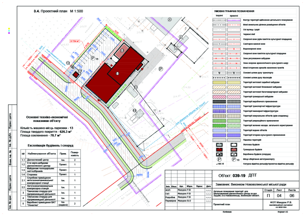Основні техніко-економічні показники проекту: Проектом передбачається будівництво та обслуговування діагностичного (медичного) центру на вул. Луцькій в м. Нововолинську, на земельній ділянці площею 0,0704 га, площа забудови – 16,0 кв.м, площа замощення – 609,3 кв.м, площа озеленення – 78,7 кв.м.