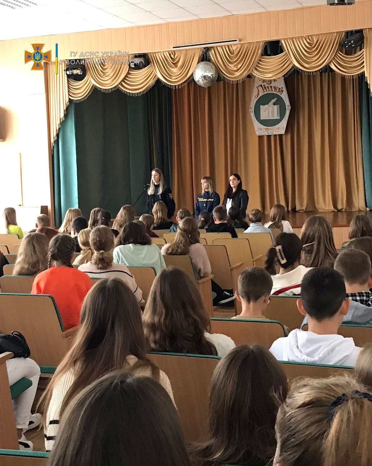 Співробітники Володимирського РУ вкотре провели «Єдиний урок безпеки» для здобувачів освіти та керівників гуртків Володимирського району з метою безпечного навчального середовища в умовах війни. Під час заходу рятувальники розповіли про правила поводження під час сигналу «Повітряна тривога», про мінну та пожежну безпеку. Також була проведена тренувальна евакуація присутніх дітей з приміщення закладу ліцею до первинного укриття. Також співробітники ДСНС роз’яснили алгоритм укриття в захисних спорудах цивільного захисту, правила поведінки в укритті, який повинен бути вміст “рюкзака безпеки”.