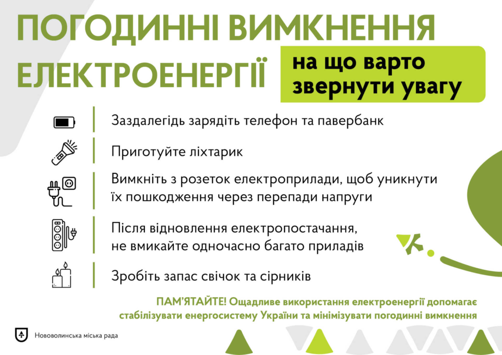 У Нововолинській громаді, як і у по всій Україні, періодично застосовують графіки погодинного відключення електроенергії. Мусимо трохи потерпіти незручності, поки тривають роботи із відновлення енергосистеми нашої держави після терористичних атак росії.