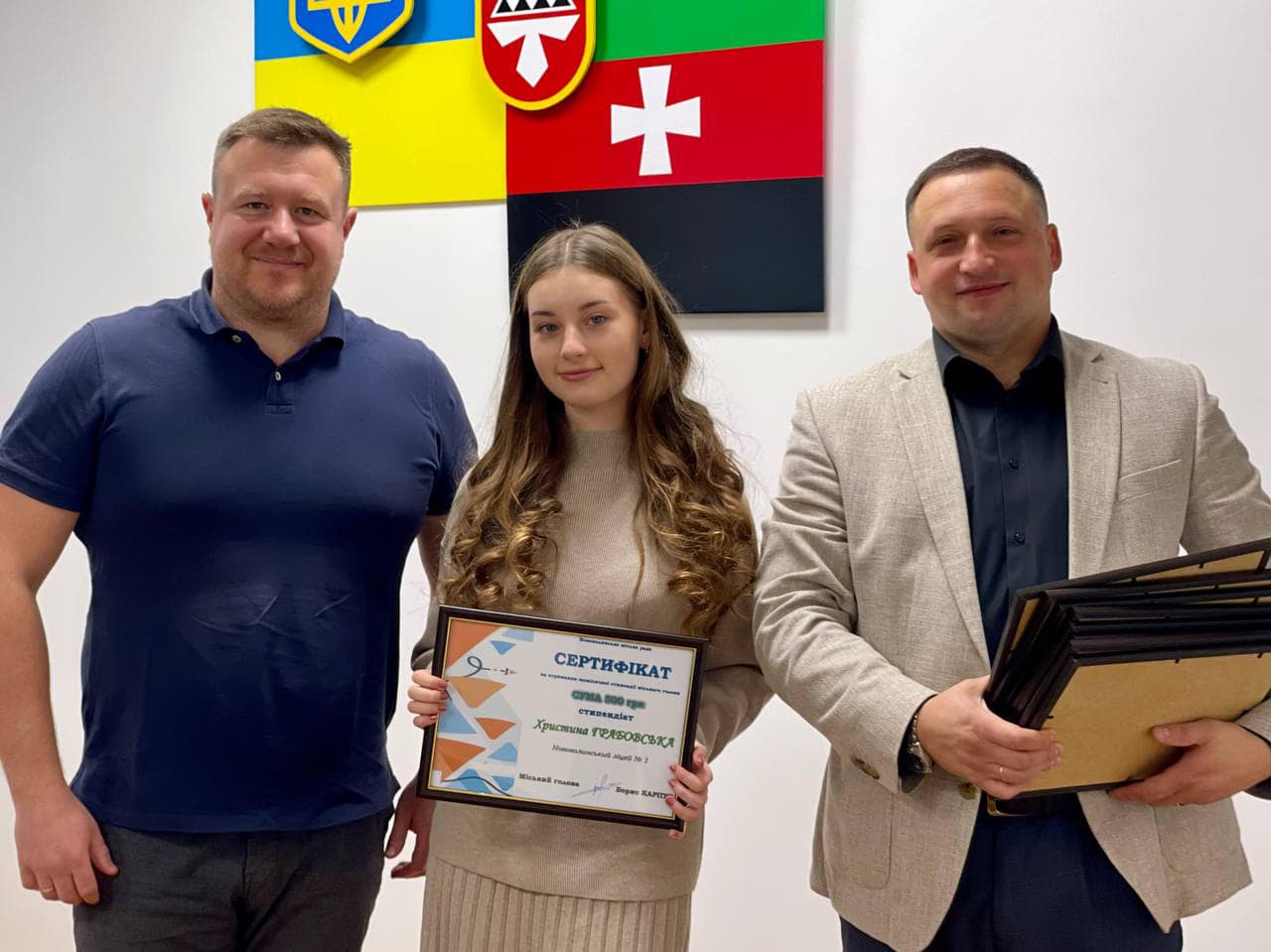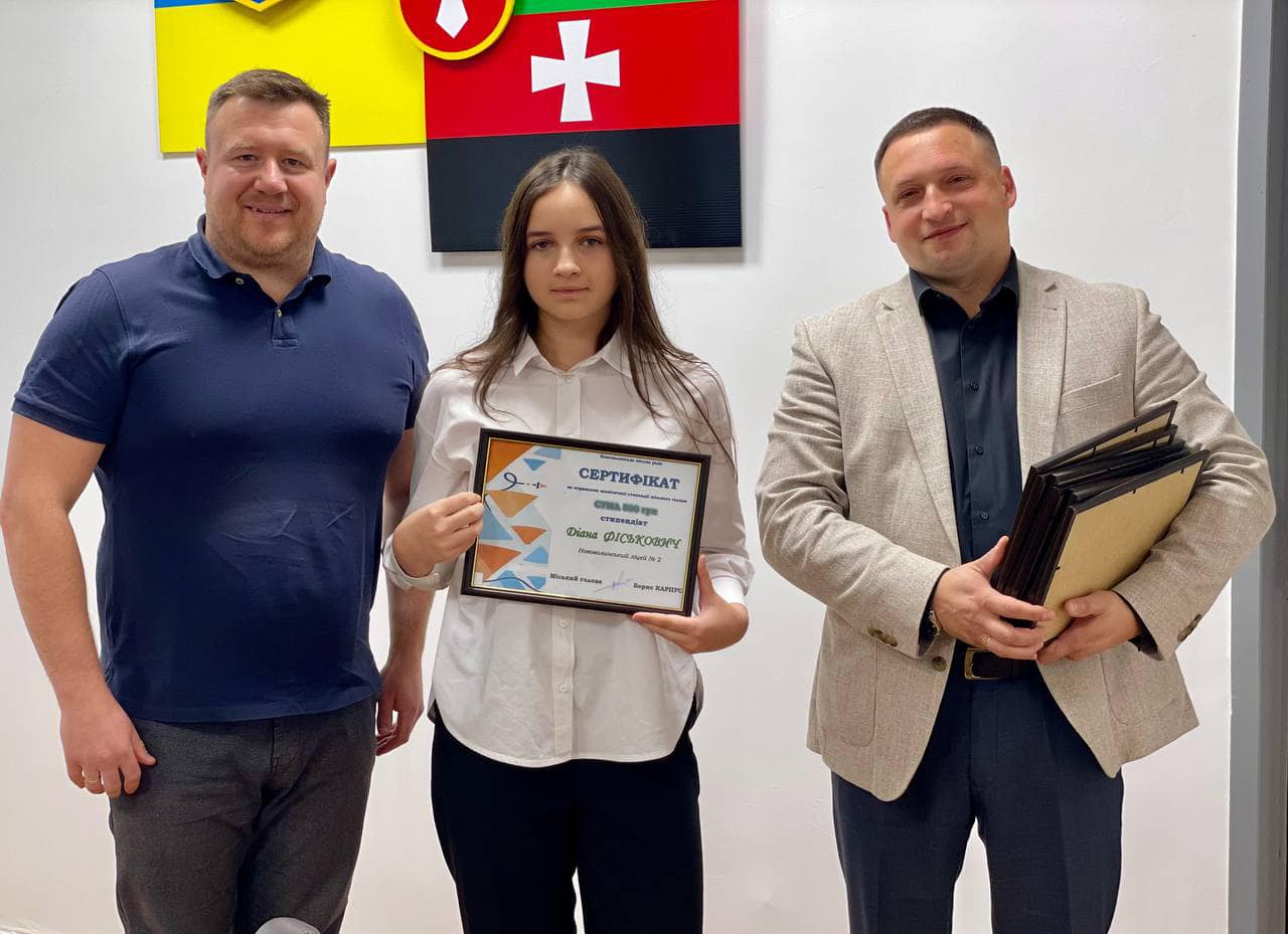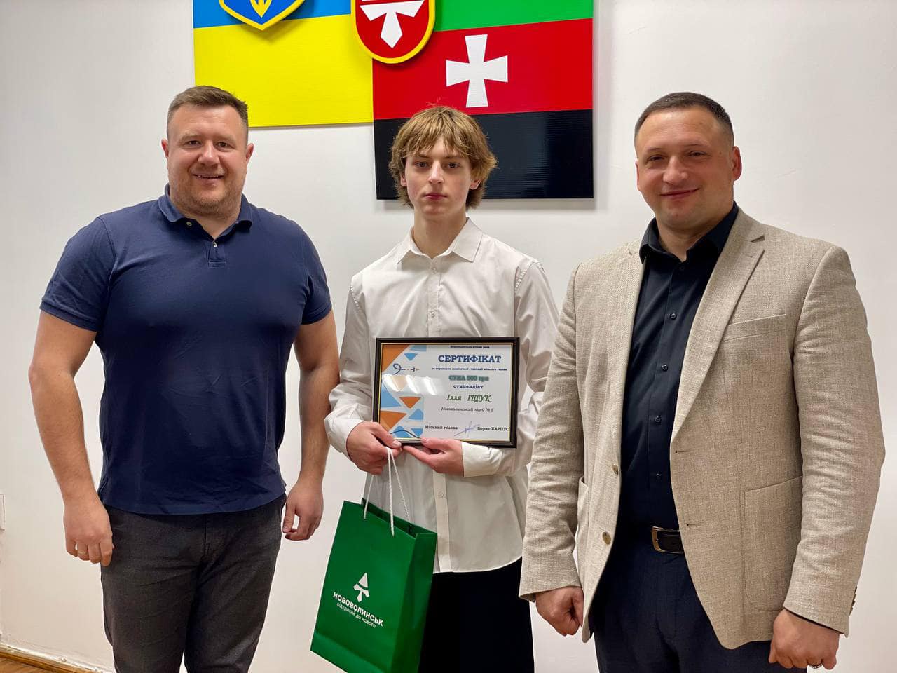 Сертифікати на стипендії та подарунки вручили: Христині Грабовській, учениці 10 класу Нововолинського ліцею № 1, Діані Фіськович, учениці 9-Б класу, Нововолинського ліцею № 2, Єлисею Голяну, учню 10 класу, Нововолинського ліцею № 3, Тарасу Лавренюку, учню 11 класу, Нововолинського ліцею № 4, Ярині Сак, учениці 11 класу, Нововолинського ліцею № 5, Михайлу Гуцкалову, учню 9-А класу, Нововолинського ліцею № 6, Роману Прімі, учню 9-А класу, Нововолинського ліцею № 7, Іллі Іщуку, учню 11 класу, Нововолинського ліцею № 8 і Маргариті Ромасюк, учениці 10 класу, Нововолинського ліцею № 9.
